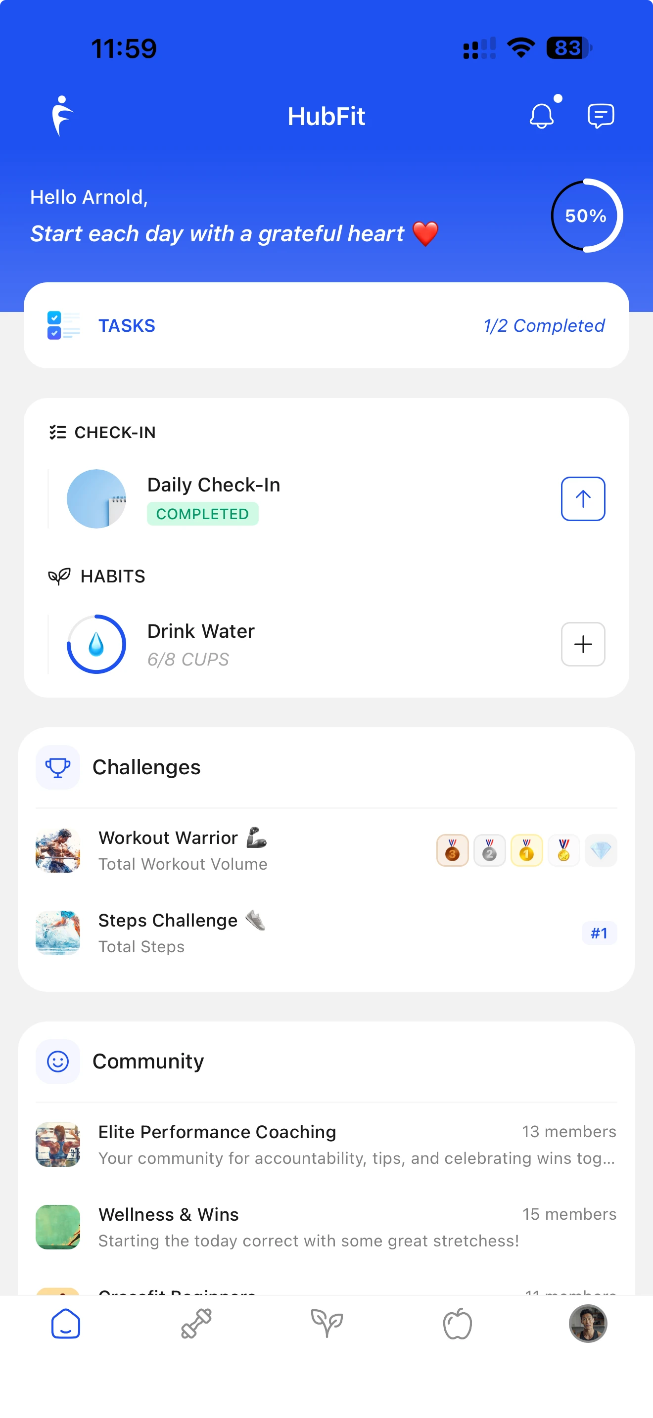 A clean home screen showing today's tasks, upcoming workouts, habit streaks, and coach messages at a glance.